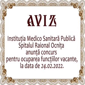A V I Z Instituția Medico Sanitară Publică Spitalul Raional Ocnița anunță concurs pentru ocuparea funcțiilor vacante, la data de 24.02.2022, după specialități.