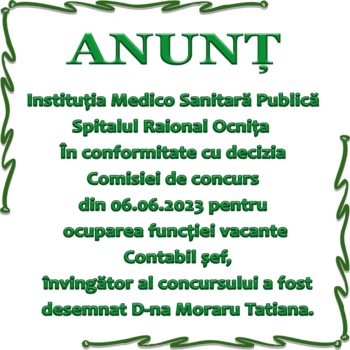 IMSP Spitalul Raional Ocnița în conformitate cu petrecerea concursului pentru ocuparea funcției vacante contabil șef, în temeiul Procesului verbal al ședinței Comisiei de concurs pentru ocuparea funcției vacante din 06.06.2023, anunță rezultatele concursului: În conformitate cu decizia Comisiei de concurs pentru ocuparea funcției vacante Contabil șef, învingător al concursului a fost desemnat D-na Moraru Tatiana.