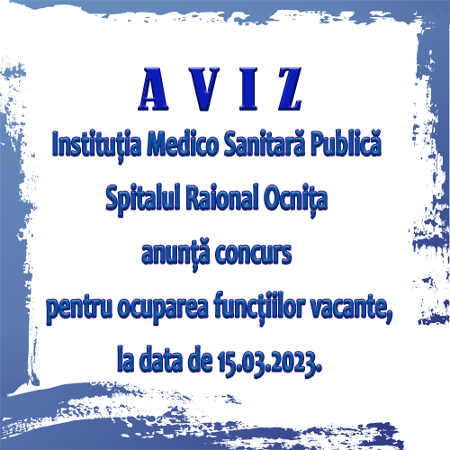 Instituţia Medico Sanitară Publică Spitalul Raional Ocniţa anunţă prelungirea termenului depunerii dosarelor la concursul pentru ocuparea funcţiei vacante