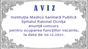 IMSP Spitalul Raional Ocnița anunță concurs pentru ocuparea funcțiilor vacante, la data de 20.12.2021, după specialități.