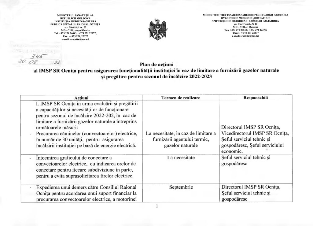 Plan de acțiuni al IMSP SR Ocnița sezonul de încălzire 2022-2023